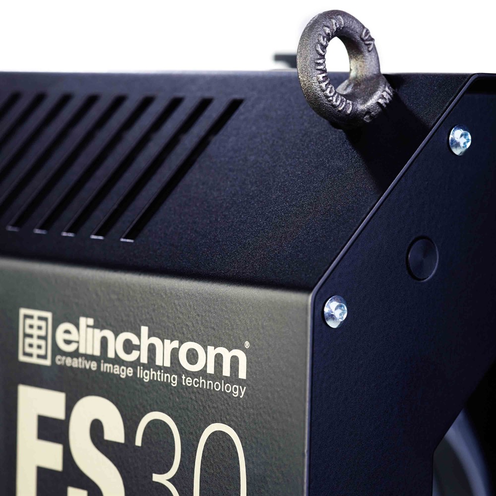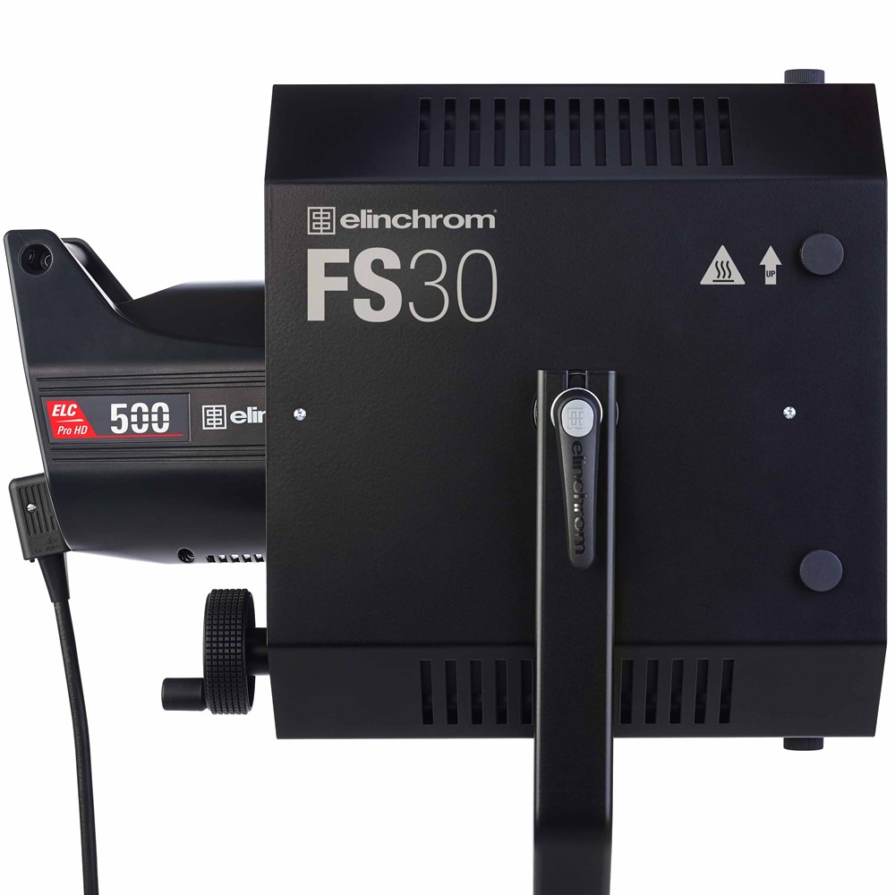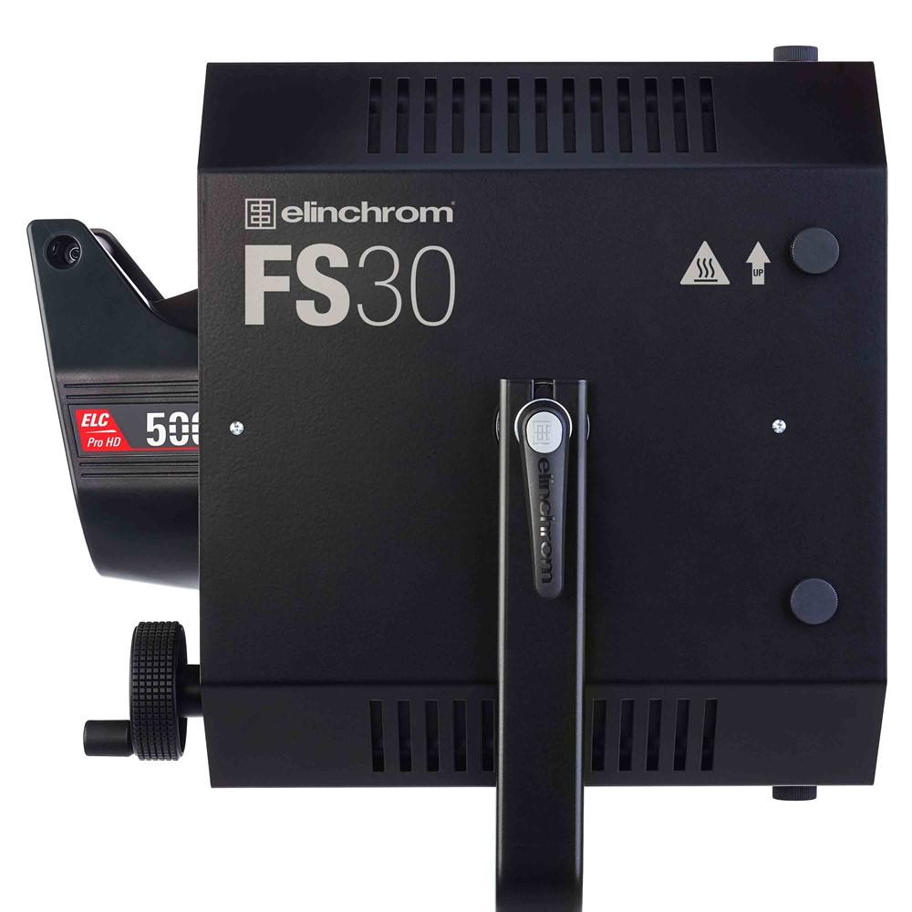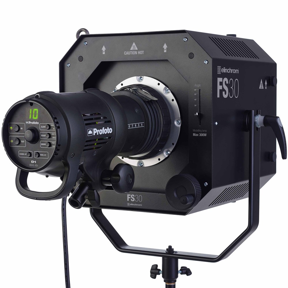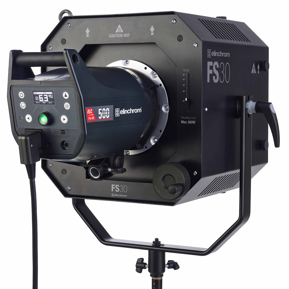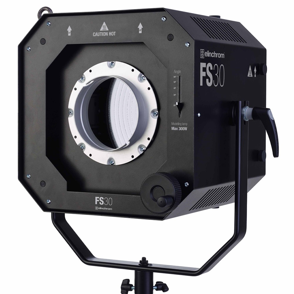 Elinchrom Fresnel Spot FS30. Offering very directional deep shadows with intense colour saturation, 3 dimensionality is guaranteed. Efficient optics and high Swiss precision mechanical engineering insures the highest quality of light. With a lens diameter of 30 cm and a variable angle of 20° to 60°,  the FS30 offers a classical cinema light, ideal for fashion and beauty photography.