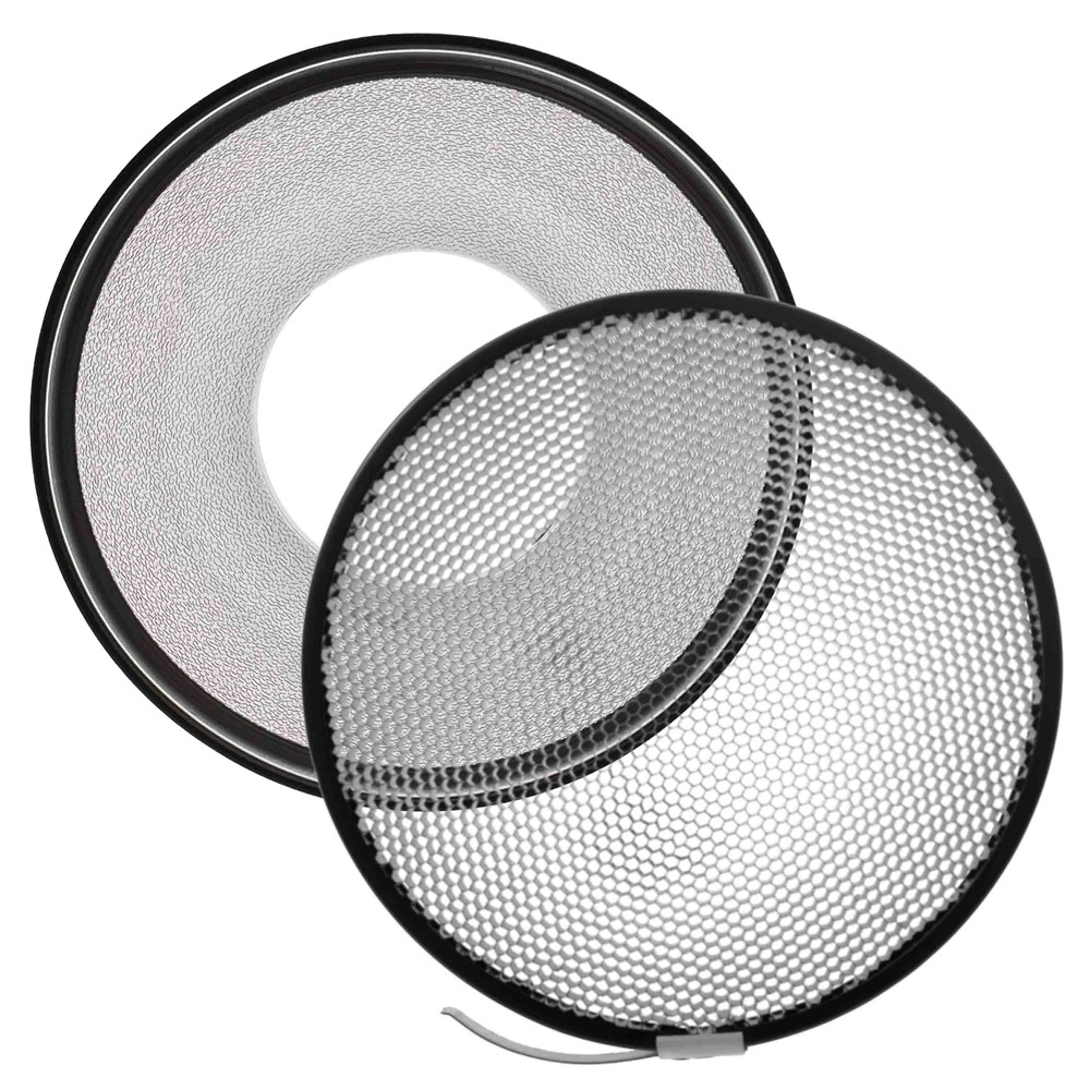 Elinchrom Reflektor mit Wabengitter 30°Der Standardreflektor mit 21 cm Durchmesser erzeugt einen mittleren Abstrahlwinkel mit hartem, kontrastreichem Licht. Er kann sowohl für direktes als auch indirektes Licht in Verbindung mit Elinchrom Schirmen verwendet werden. Das enthaltene 30° Wabengitter begrenzt die Lichtverteilung und erzeugt einen weich begrenzten Lichtkreis im Hintergrund sowie definierte Schatten am Motiv. Zusätzliche Wabengitter mit 20° und 12° sind separat erhältlich. Der Reflektor ist zudem kompatibel mit dem Abschirmklappen-Kit, um das Licht weiter zu formen oder Farbfilter anzubringen.