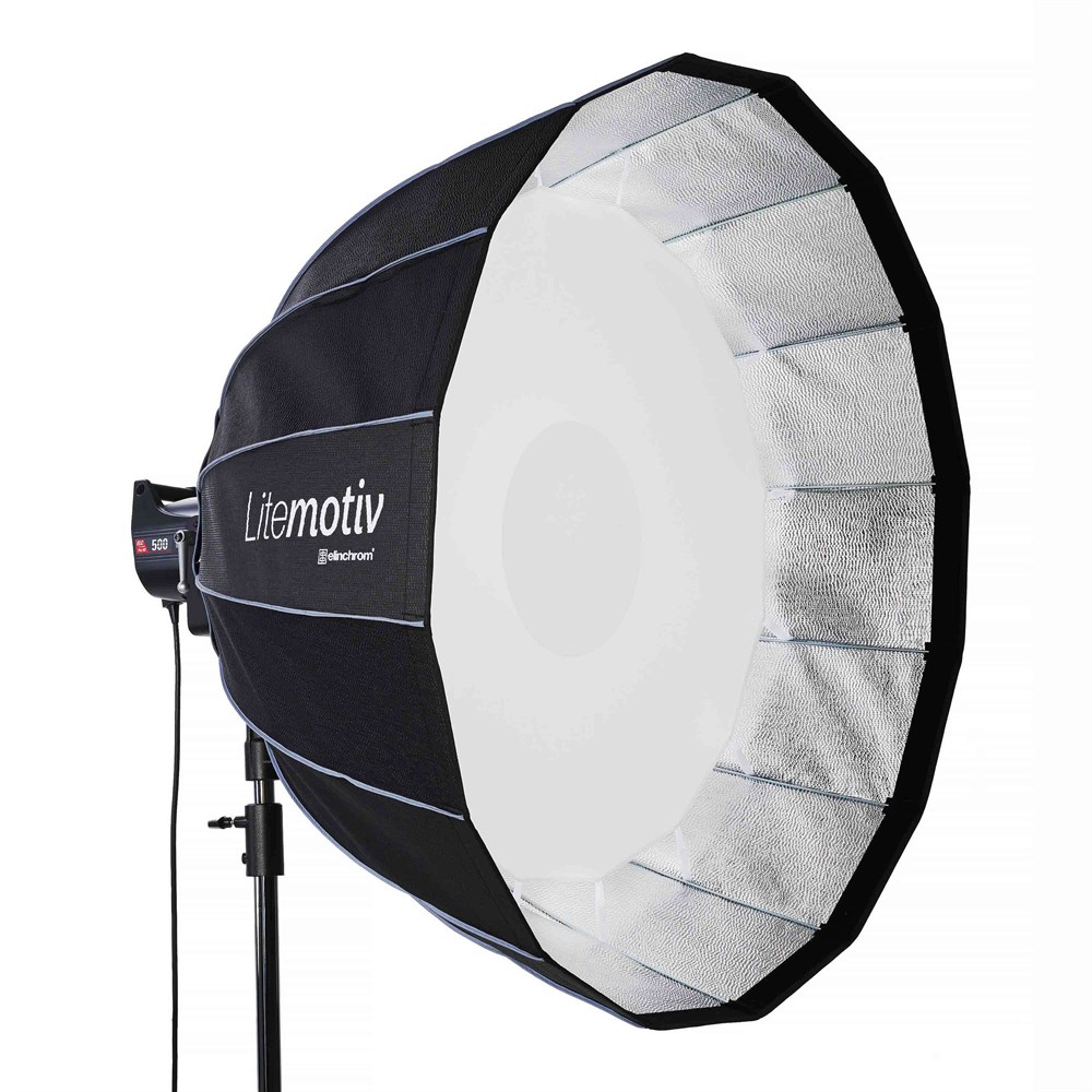Elinchrom Litemotiv 120 cm. From monster Beauty Dish to monster Softbox! Introducing the Elinchrom Litemotiv range, the parabolic extension to Elinchrom's Rotalux Deep Octa 70 and 100cm softboxes. These 16 sided softboxes produce close to perfect circular catch-lights and with a heavy duty bracket (sold separately) for precise and easy positioning of the light.